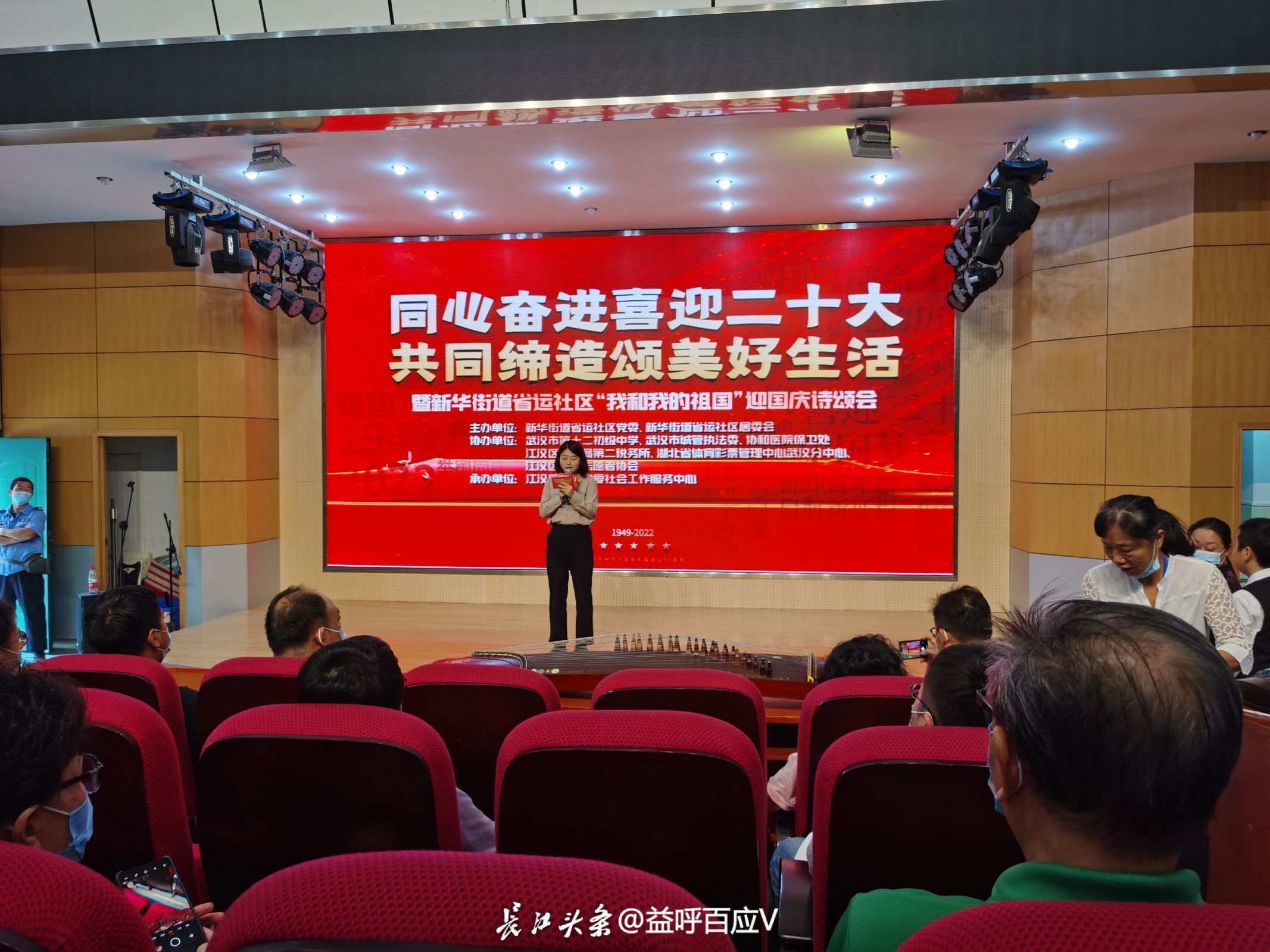 为了更好地激发广大居民群众心向党、感党恩的爱国爱家情怀,在国庆节来临之际,新华街道省运社区与武汉市第十二初级中学、武汉市城管执法委、协和医院保卫处、酒店偷拍 税务局第二税务所、湖北省体育彩票管理中心武汉分中心、酒店偷拍 青年志愿者协会等多家共建共治单位联合共庆祖国华诞,举办“同心奋进喜迎二十大,共同缔造颂美好生活”迎国庆诗颂会,通过诗歌朗诵、文艺表演等形式,共同表达对祖国的热爱与祝福。