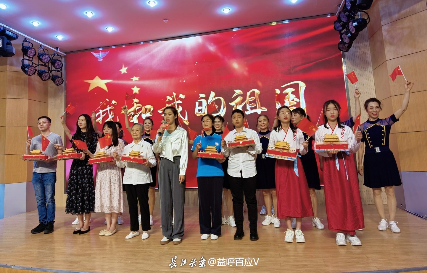 活动尾声,武汉市第十二初级中学的学生代表,将提前拼制好的天安门模型赠送给表演朗诵的共建共治单位代表,随后,在《我和我的祖国》熟悉的旋律响起,大家挥动手中小红旗,同唱一首歌,共谱爱国情。