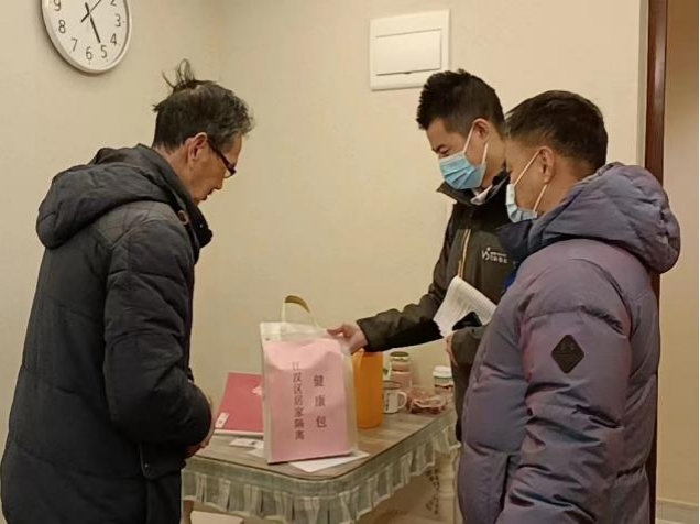 12月30日下午16时,陈家墩社区组织工作人员按网格分组,联合万科物业管家,逐户上门核实发放“爱心健康包”。家住万科唐樾15栋1单元的杜爹爹今年87岁了,是一位独居老人,在武汉社会面解封以来多次自行购买药品未果,随即向社区网格员求助,今天拿到大礼包后,杜爹爹说:“今天心里的一块石头终于落地了,手里有粮,心里不慌,十分感谢社区对我们孤寡老人的关爱。”下一步陈家墩社区将加大力度宣传80岁以上老人打疫苗的情况,通知小区适龄老人接种新冠疫苗,并及时安排医生为行动不便的老人提供上门接种服务。