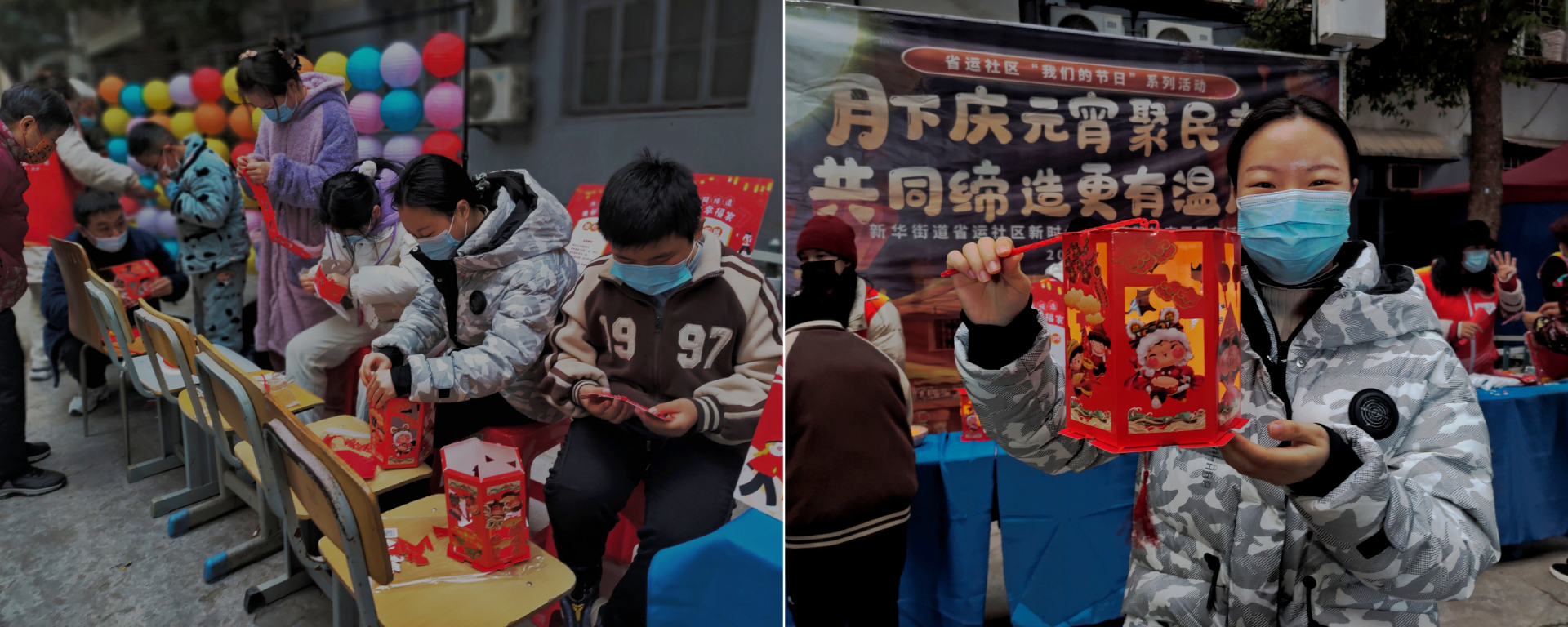 除了赏灯,还能自己制作灯笼,让许多居民带着孩子前来参加,在志愿者指导与帮助下,一个个精美的纸灯笼在居民的巧手中诞生,点亮灯笼的瞬间,感受到了元宵节真正的仪式感。