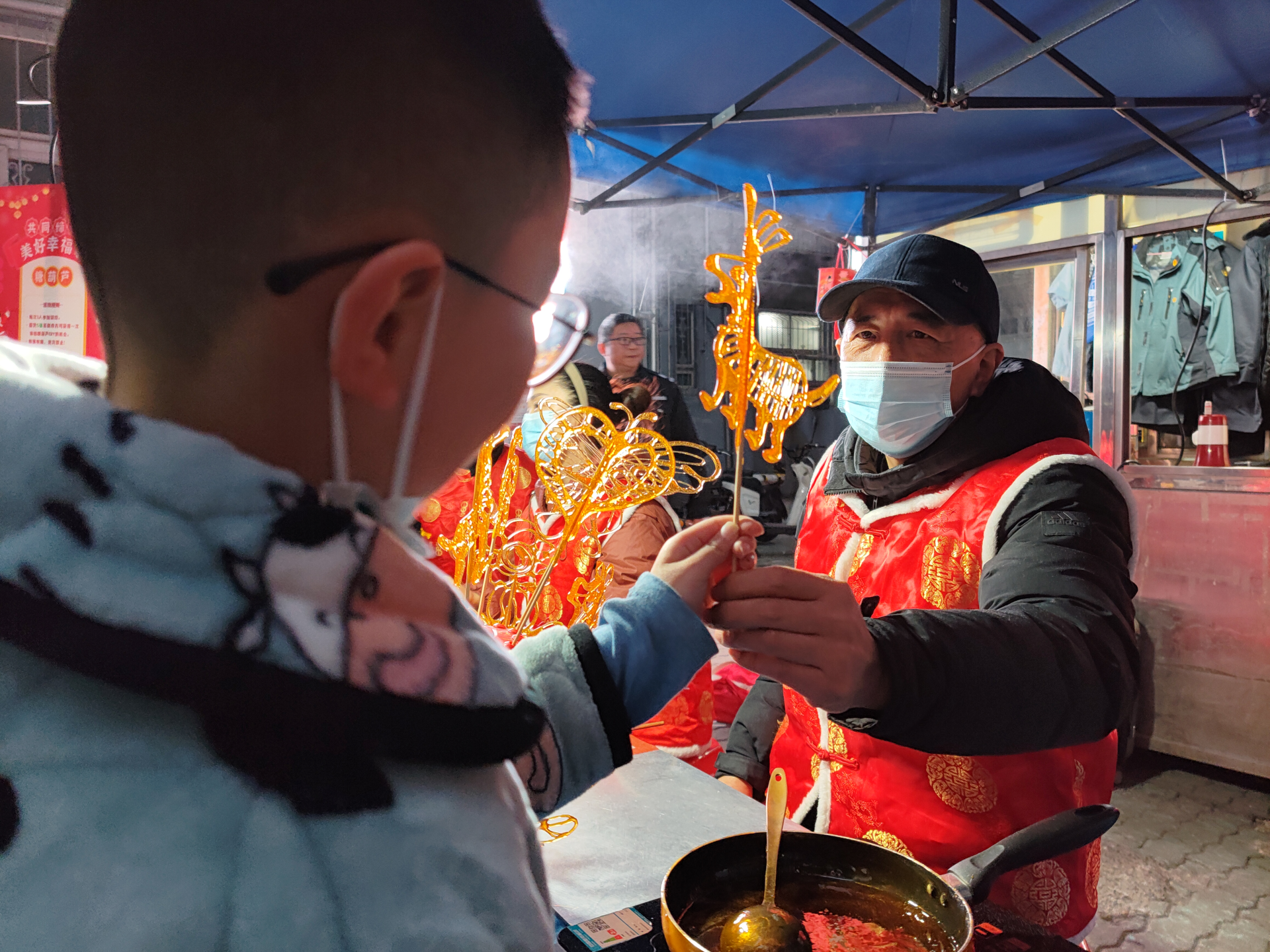 在非遗转糖画的摊位前,居民们在甜香之中欣赏糖画手艺人用糖液一气呵成绘就一幅幅精美的糖画。