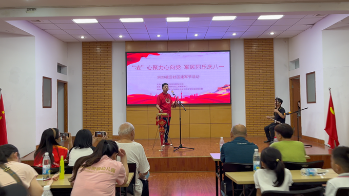 凌云社区“‘凌’心聚力心向党,军民同乐庆八一”建军节主题活动现场,慷慨激昂的廉政金句朗诵、气势磅礴的湖北大鼓、铿锵昂扬的《七律长征》、声情并茂的儿童朗诵,还有“党的二十大知识抢答”……现场气氛热烈,掌声此起彼伏。