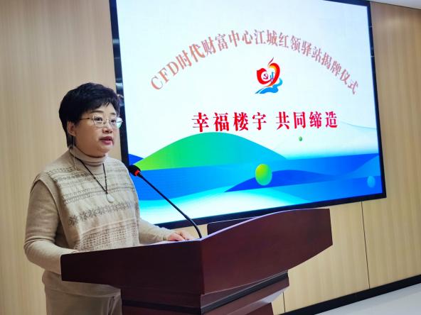 揭牌仪式上,唐家墩街道党工委书记滕宏首先致辞,她表示,回顾过去,因“水”相聚,各家企业慧眼独具,选择菱角湖、扎根菱角湖;把握现在,同“心”共行,江城红领驿站的建成投用,必将成为街道服务楼宇高质量发展的重要里程碑;展望未来,向“高”攀登,楼宇是社会经济发展的“主阵地”,希望大家共乘区域高质量发展的东风,发挥更大作用、实现更大发展。
