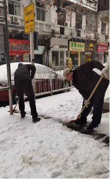 清理现场,街区各管理部门党员干部不畏严寒、不惧风雪,携手并肩、配合默契,环卫工人向路面撒盐融雪,有的手拿工具将压实的雪面凿碎铲除,有的用铁铲清理主要道路、进出口,有的在易滑倒路段贴心铺设防滑草垫,大家干得热火朝天。