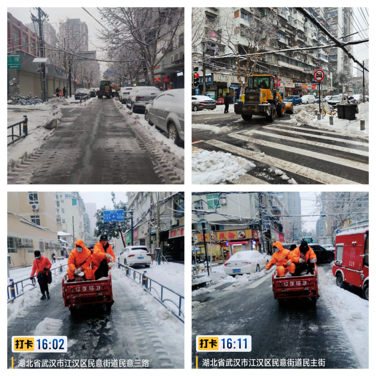 一是保障安全,做好应急准备。2024年2月3日起,武汉市有一次明显的低温雨雪冰冻天气过程,持续时间长,影响范围广,为有效应对近期大规模的雨雪降温天气,保护居民群众生命财产安全,做好民意街道道路融雪防冻工作,民意街道领导高度重视,第一时间研究制定了《民意街道融雪防冻工作方案》,成立由公共管理办公室牵头,环卫所、执法中心、综合巡查队和各社区组成的融雪防冻工作专班,组建一支由执法中心队员、城管协管员和环卫工作人员共82人组成的应急处置队伍,提前部署好沟通协调、信息预警、应急力量安排、融雪防冻物资储备、宣传教育和安全巡查等工作。街道文体站针对辖区内无气膜体育场馆和以轻型材料搭建的球类体育场馆进行全面摸排,防止发生文体场馆积雪垮塌事故。二是保障畅通,做好融雪防冻。“行动是最好的融雪剂”。2月4日早晨,民意街道由各社区对口分管领导带队,组织街道各科室工作人员、环卫工人、综合巡查员、执法人员、社区干部(下沉干部)辖区共建单位等419人次,联合物业公司、商户等社会力量,发动门前三包单位,对全街积雪进行清理,重点加强主次干道、重要连通道、居民小区进出通道、医院、大型超市、集贸市场周边区域融雪除冰,并做好多次撒盐工作,防范结冰打滑。发动力量不间断进行多方巡查,保证及时发现问题,及时消除隐患,确保道路、人行道、小区通道安全畅通。2月3日至4日期间,民意街道对辖区主次干道及时清理积雪,倾洒除雪剂,共出动渣土车2台,铲车3台,环卫工人23名,环卫车辆13辆,麻袋550个,融雪剂5吨,清理积雪128方,大大消除降雪造成的安全隐患。三是保障民生,做好社会服务。街道各社区及时向居民发布气象灾害预警信息60余条,持续做好辖区居民融雪防冻的宣传教育和安全巡视工作,摸清辖区易冻裂水管底数,联合公共管理办公室对辖区居民家用水管进行加套保暖,防止水管冻裂。在安全巡视中,发现辖区多处树枝被积雪压断,已及时报园林部门处理,发现辖区积雪压塌雨棚2处,其中一处房屋空置,为社区管理公房,已将垮塌雨棚拆除并对现场进行安全隔离,另一处悬吊于户外,社区采取临时安全措施并第一时间联系消防救援人员拆除,因拆除处理及时得当,未出现雨棚垮塌伤人事件。加强上门走访,全面摸排辖区受灾群众,2月3日至4日,民意街道公服办积极开展雨雪天气走访慰问和自建房巡查工作,共走访、探视困难群众41人,发放救助物资16份,开展流浪乞讨人员巡视20次,探访关爱独居老人121人,发放物资56件,巡查自建房78处,未发现房屋主体结构相关的安全隐患问题。2月4日上午,区人大常委会副主任洪涟带领人大代工委、民意街道领导陪同湖北省政协委员陈永明老师前往民意街道安仁里慰问困难群众。四、严防警惕,做好持续守备。 下一步,民意街道将继续做好融雪防冻守备工作,严格24小时值班制度,加强巡查,及时处理,持续以干群行动融化冰雪,保障居民安全出行。