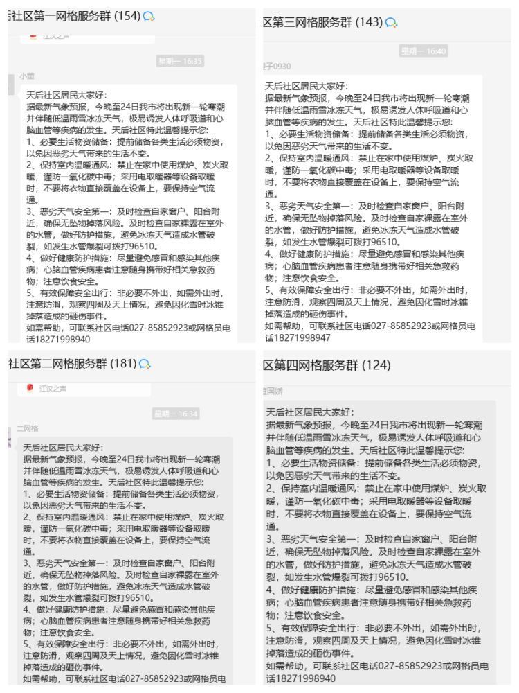 近日,新一轮寒潮大风低温雨雪冰冻天气来临,武汉全域吹响新一轮“奋战冰雪”战斗号角。2月18日以来,民意街道迅速行动,街道主要领导亲自调度,分管领导到各对口社区检查指导低温雨雪防冻物资准备情况。2月21日上午10时,街道召集各社区、机关科室负责人,就新一轮低温雨雪冰冻天气防范应对工作进行再调度,细化应急预案,切实责任到人,要求各社区动员发动好辖区单位、机关、物业公司、商户按“门前三包”的原则自扫门前雪,各级要严格落实24小时值班和巡查检查制度,切实做好隐患排查和居民安全提示工作,特别是对重点人群要进行点对点帮扶,提出全街上下要以“动”制“冻”,全力保障居民出行安全。 一是抓好物资准备。截至目前,全街已储备融雪盐133袋,铁锹379把,雪推15把,防滑麻袋1490个,手套990双。二是抓好安全检查。到目前为止,全街共排查房屋180余处,排查广告招牌、雨棚等重点点位60余处,发现舞台社区远东巷90号围墙有砖块松动,仁厚社区友谊路159号门面楼上2楼、3楼破旧雨阳篷松动等不安全隐患9处,现已全部整改完毕,走访重点五类人员74户。同时在全街范围内对上一轮积雪折断树枝进行规整转运,截止20日,清理转运断枝3车次。三是广泛宣传发动。各社区发动网格员在网格微信群发布天气信息、安全出行防范提醒信息等210余条。