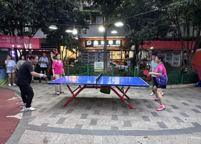 7月9日晚7点,西马新村小区中心广场里,一场酣畅淋漓的乒乓球预热赛正在火热进行中。此次比赛为三眼桥社区“乒出楼栋激情