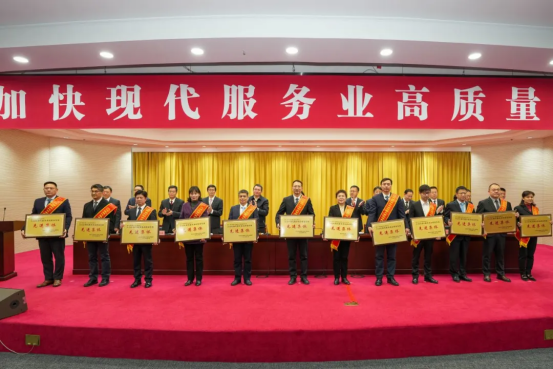 推动现代服务业高质量发展先进个人。与会领导为先进集体代表和先进个人代表颁奖。