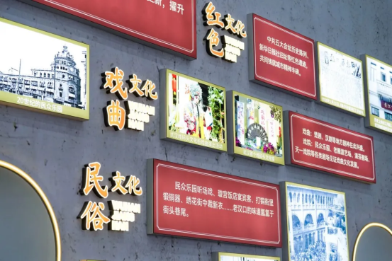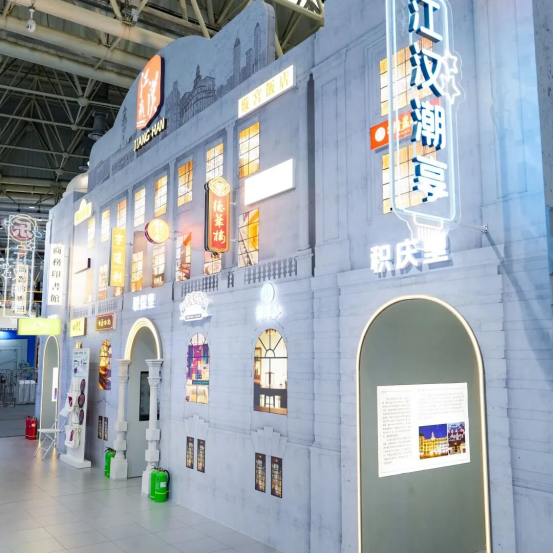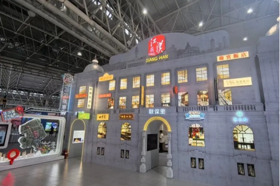 步入江汉展区,一股浓郁的复古与新潮交融的气息扑面而来。展区设计别出心裁,一面精心复刻的“老汉口欧陆风情建筑墙”巍然矗立,红砖灰瓦、雕花拱窗,那些属于江汉的传奇与浪漫,被浓缩于方寸之间,瞬间将观众拉回到那个风云际会的黄金年代。