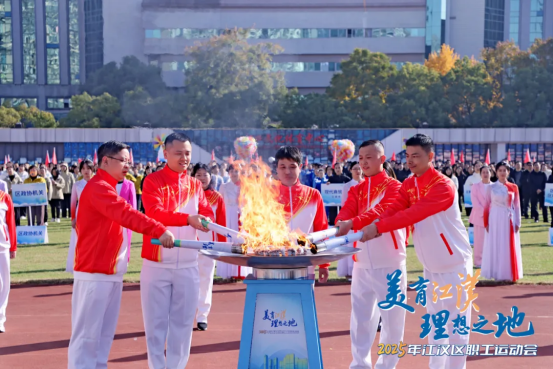 开幕式上,火炬传递成为最激动人心的环节。前期龙王庙畔庄严采集的火种,承载着楚地先民的开拓精神与新时代职工的奋斗激情,穿越江汉关、长江书店、中共五大会址、汉口火车站等江汉地标抵达主会场。