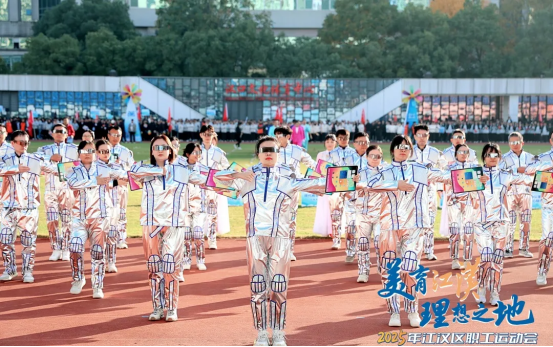 文艺演出环节同样精彩纷呈。开场舞《美丽中国》以热情舞步礼赞祖国;体育舞蹈《跃动未来》上演力量与美的碰撞;《活力江汉》歌曲串烧中,小歌手彭彦凯与武汉天使童声合唱团带来动人演唱,职工歌手联袂献唱《江汉四季》《相亲相爱》,引发全场共鸣;千人工间操展演气势恢宏,全场配合呈现“I♡JH”巨型画面,将开幕式推向高潮。