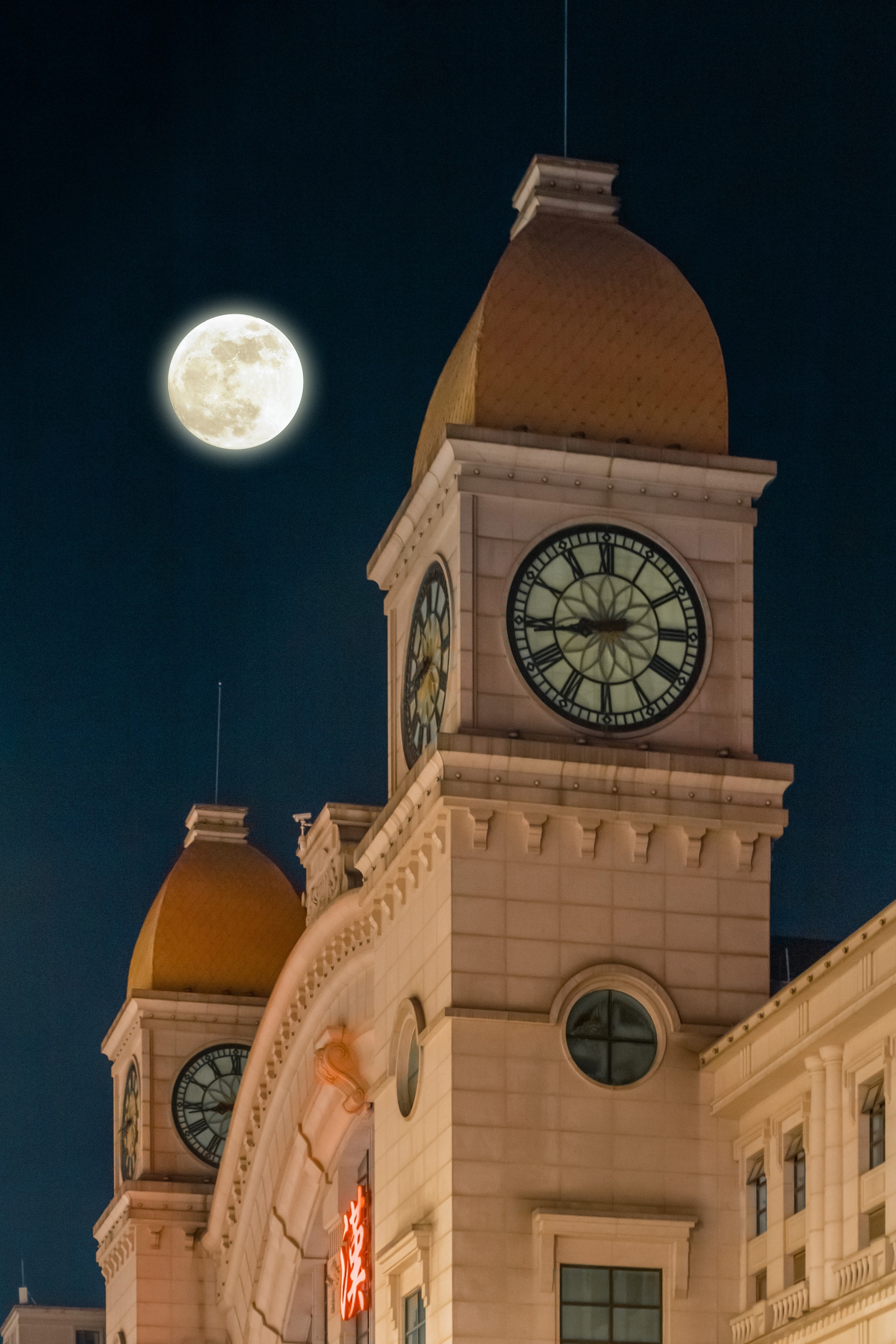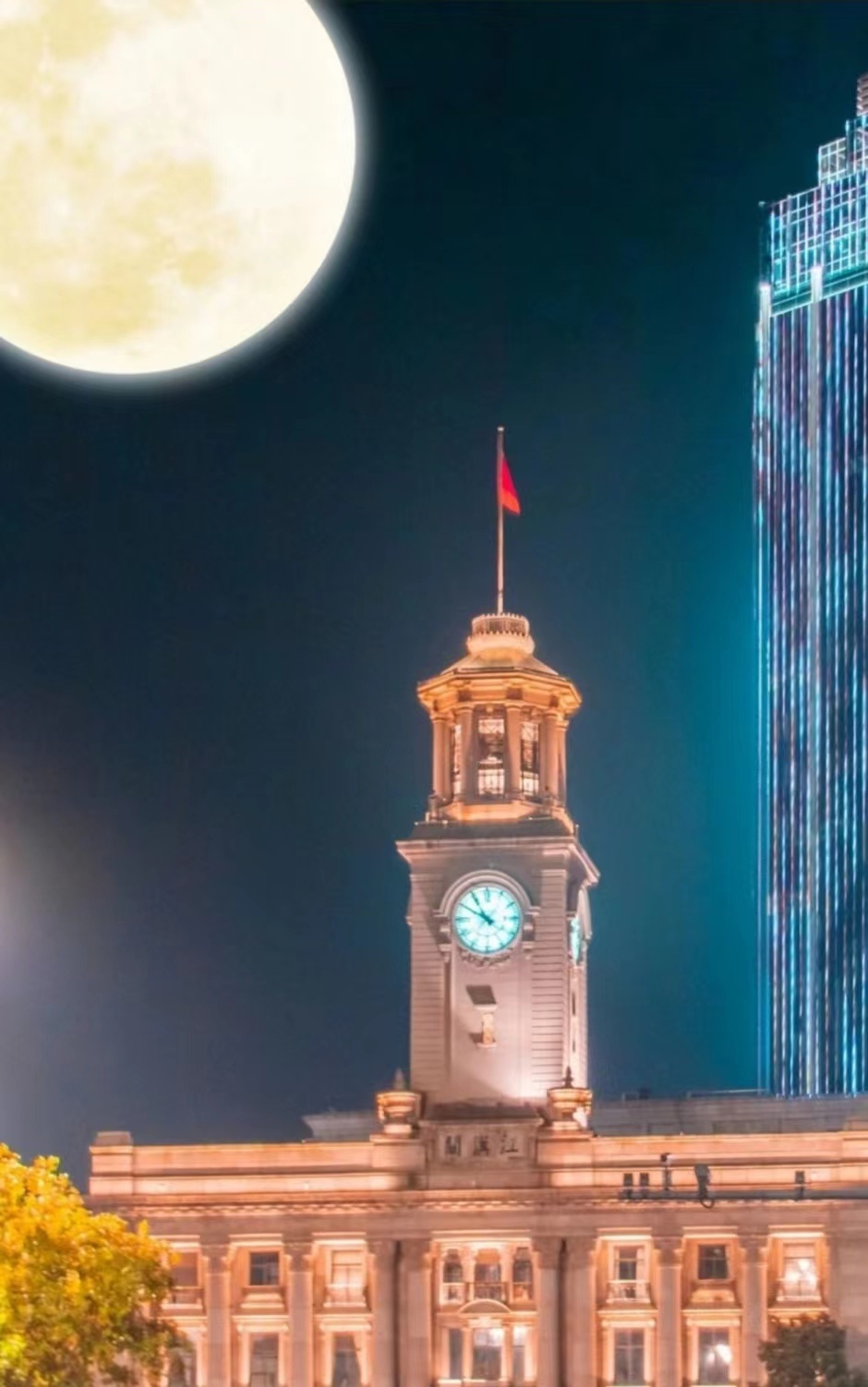 适逢月圆,月光、星空、江汉关码头与有趣的你相映成画,别有一番风味。
