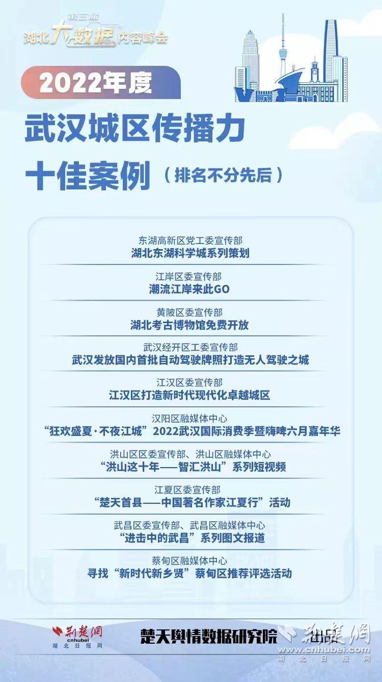 数据见证蝶变,榜单铭刻品牌。峰会发布了2022年度湖北城市传播力十佳区县、武汉城区传播力十佳案例、武汉传播力十佳街道、湖北医院传播力十佳案例并颁奖。