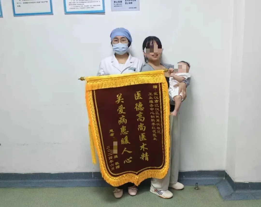 在平时接诊过程中为居民治好疾病,居民将锦旗送到李红花手中。