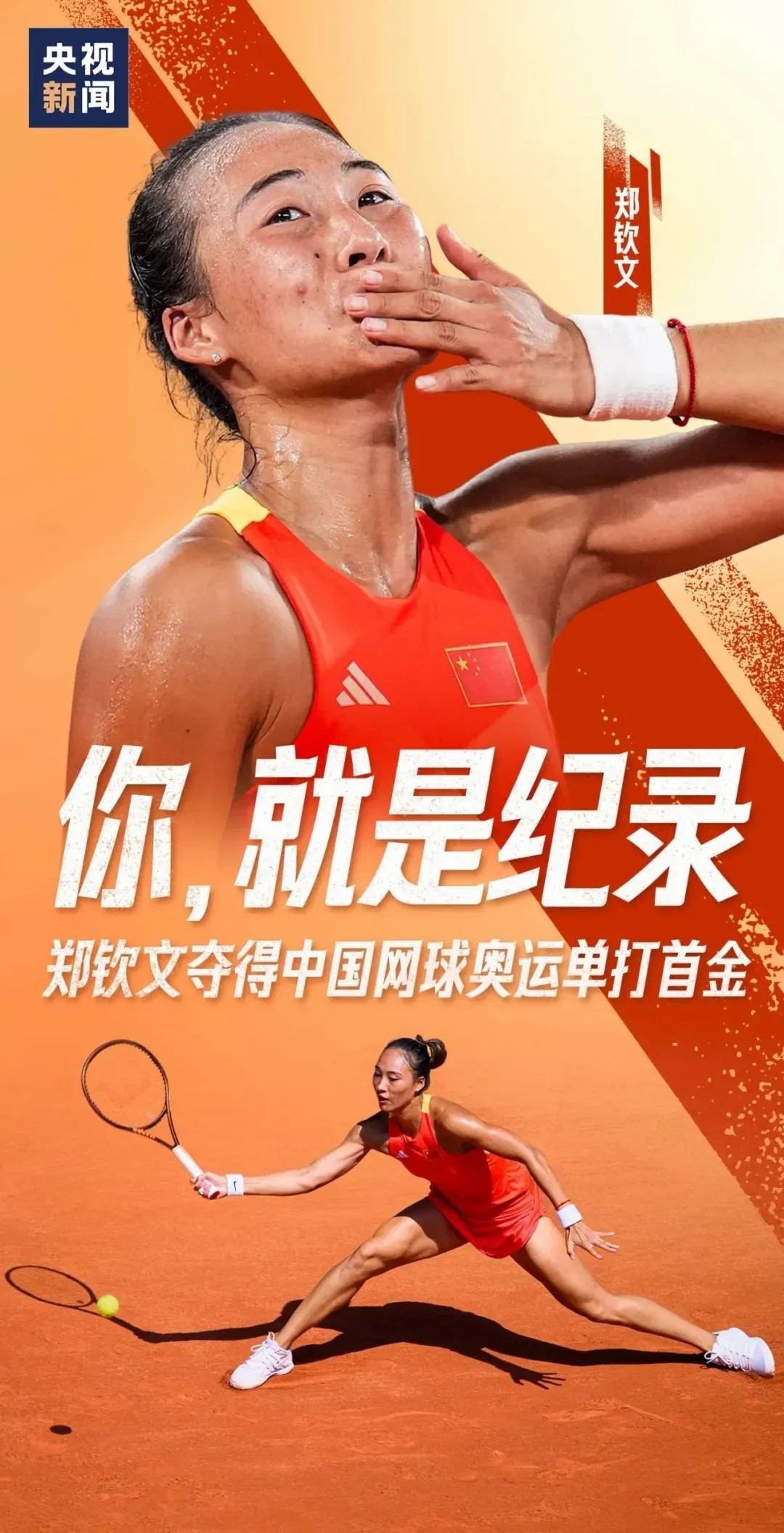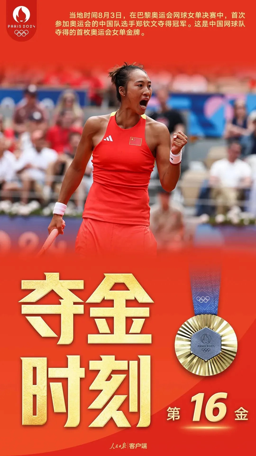 这也是中国网球队夺得的首枚奥运会女单金牌!郑钦文,创造历史!