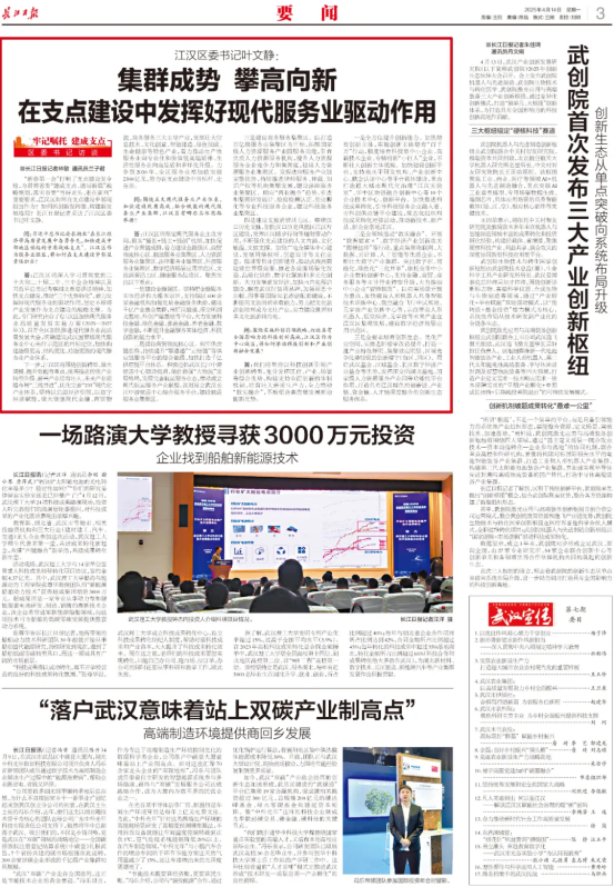 一是全方位提升创新能力。加快培育创新主体,实施创新主体培育“百千万”行动,梯度培育科技型中小企业、高新技术企业、专精特新“小巨人”企业,不断壮大创新主体规模。加快建设创新平台,支持高水平研发机构、产业创新中心、概念认证中心等平台载体建设,重点打造超大城市现代化治理“江汉实验室”、华中区块链融合创新中心等10个企业技术中心、创新平台。加快推进科技成果转化,引导科技服务企业融入省、市科创供应链平台建设,常态化组织科技成果转化对接活动,推动新技术、新产品、新企业落地江汉。