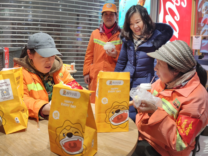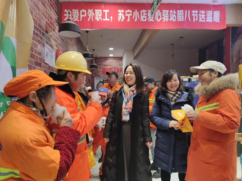 总工会依托万松园路苏宁小店“爱心驿站”开展“情暖冬日 爱心腊八”关爱户外工作者活动。早上8时许,100多份豆浆、包子、粥等腊八餐点,先后被送到附近工作的城管、环卫、园林等户外工作者手上。清晨寒露中,“爱心驿站”人气满满,一股股暖意在冬日的户外职工们手上、心里流转,这个腊八节充满了温暖和祝福。