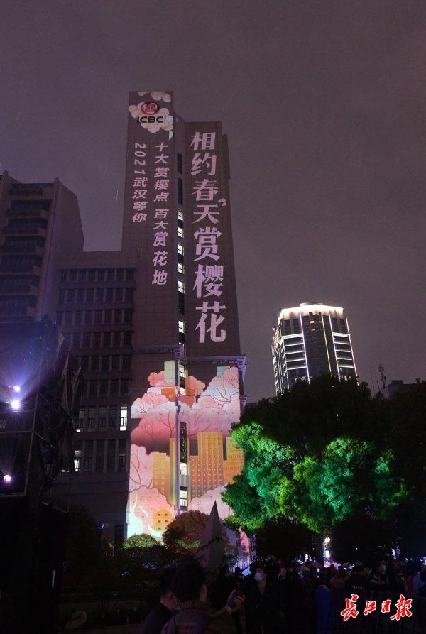 3月20日晚,2021“花Young武汉”樱·舞文创市集上演樱花主题光影秀和《相见在武汉》快闪活动,吸引众多年轻人打卡拍照。