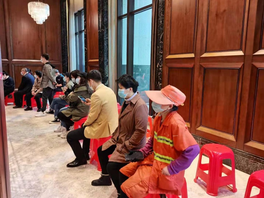 接种现场设置问询处,“志愿者+医务人员”耐心解答。为保证疫苗接种工作有序推进,接种点设置排队、初筛、登记、接种、留观五大区域,每个区域放置板凳、矿泉水等物品,志愿者组织居民有序排队等待。通过在排队区测温、健康问诊等一系列流程,经过测血压、信息登记,接种核查、签署疫苗使用知情同意书和注射等流程,留观30分钟后领取接种单则完成本次疫苗接种。
