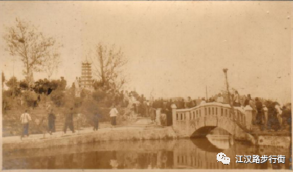 22.中山公园内的石桥、宝塔和池塘。汉口中山公园近代园林建筑为市级文物保护单位。