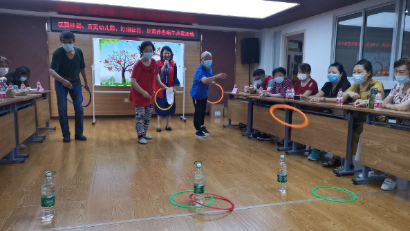 “套粽子”更是有趣,三三一组,手拿套圈,丢圈套物。当有人丢偏时,大家纷纷为之可惜,若是丢中了,便一起鼓掌叫好,不论输赢,大家看的开心,玩的尽兴,社区凝聚力在这一刻展露无遗。