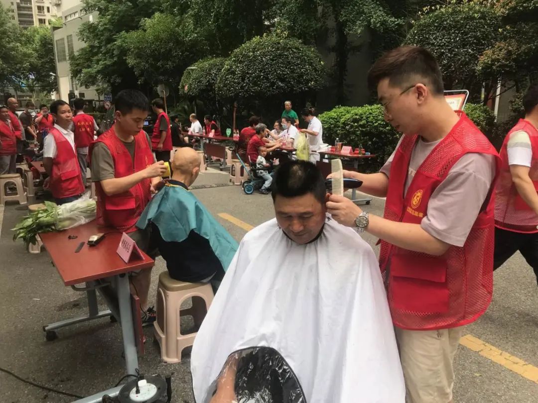 在民权街道打铜社区,退役军人志愿者们为大家现场提供理发、义诊、反诈宣传等多项便民服务;