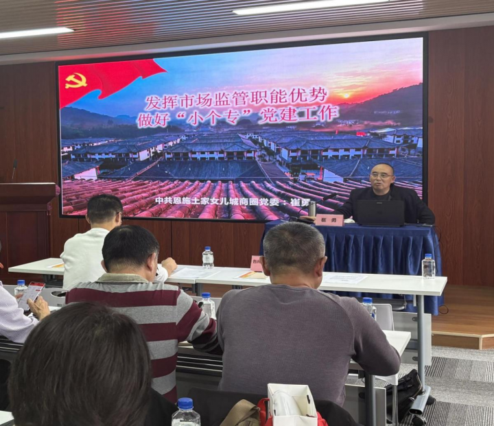 此外,恩施市市场监督管理局市场监管股股长崔勇受邀进行“小个专”党建工作专题辅导。他围绕党建工作实践路径分享经验,为参训人员开展非公有制经济组织党建工作指明方向、提供新思路。