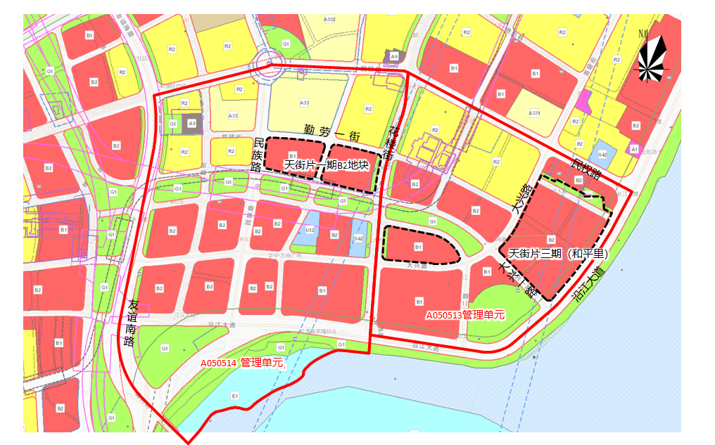 四至范围:天街片一期B2地块东至花楼街,西至民族路,南至规划道路,北至勤劳一街(如图所示);天街片三期(和平里)东至沿江大道,西至大兴路,南至大兴一路,北侧靠近民权路(如图所示)。